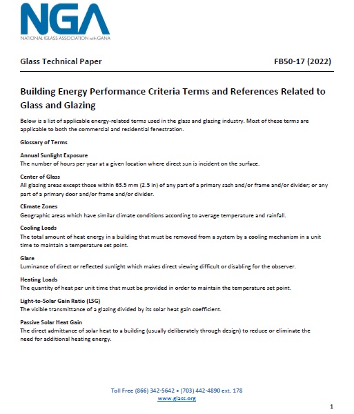 The Technical Services Division of the National Glass Association (NGA) has produced this Glass Technical Paper solely for informational purposes. This Paper was developed by dedicated member volunteers and subject matter experts. The original version of this document was approved and published in 2017. This version of the document was updated and published in June 2022. All purchases will be electronically accessed or delivered.