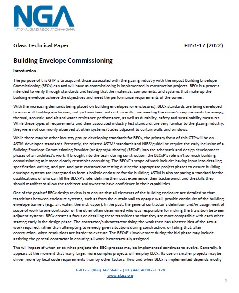 The purpose of this Paper is to acquaint those associated with the glazing industry with the impact Building Envelope Commissioning ("BECx") can and will have as commissioning is implemented in construction projects. BECx is a process intended to verify through standards and testing that the materials, components, and systems that make up the building envelope achieve the objectives and meet the performance requirements of the owner. The Technical Services Division of the National Glass Association (NGA) has produced this Glass Technical Paper solely for informational purposes.