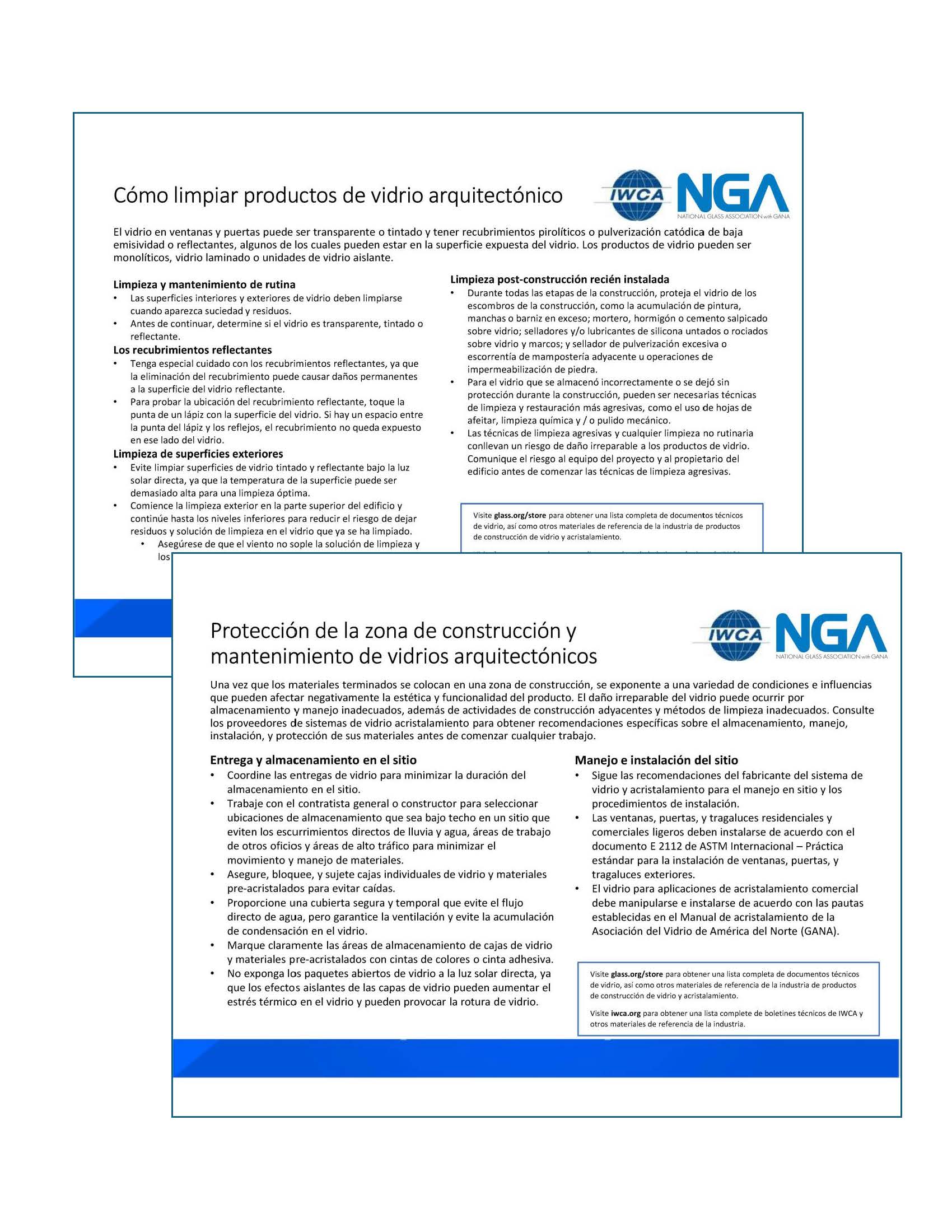 Este paquete de dos postales proporciona información derivada de dos de los documentos técnicos sobre vidrio de la NGA: FB01-00 Procedimientos adecuados para la limpieza de productos de vidrio arquitectónico y FB03-03 Protección de la zona de construcción y mantenimiento de vidrios arquitectónicos.