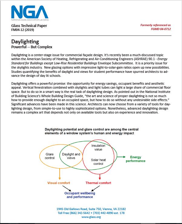 Daylighting is a center-stage issue for commercial facade design. It's recently been a much- discussed topic within the American Society of Heating, Refrigerating and Air-Conditioning Engineers (ASHRAE) 90.1 - Energy Standard for Buildings except Low-Rise Residential Buildings Envelope Subcommittee. It is a priority issue for the skylights industry. New glazing options with impressive light-to-solar-gain ratios open up new possibilities. Studies quantifying the benefits of daylight and views for student performance have spurred architects to advance the design of day lit schools. This document discusses some of the key elements of daylighting. This document was published in July 2012, and updated in 2019. All purchases will be electronically accessed or delivered.
