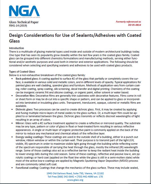 Design Considerations for use of Sealants/Adhesives with Coated Glass (FB41-14) - Downloadable Out of Stock