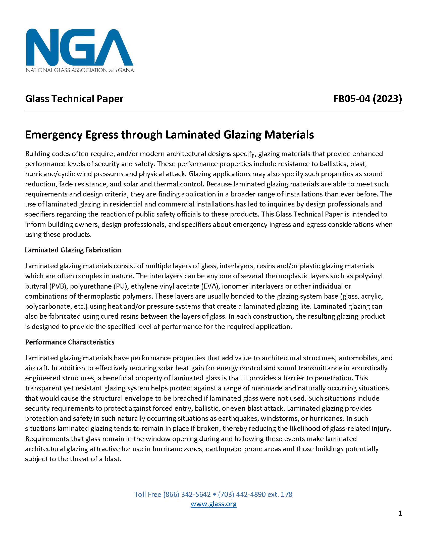 Building codes often require, and/or modern architectural designs specify, glazing materials that provide enhanced performance levels of security and safety. These performance properties include: resistance to ballistics, blast, hurricane/cyclic wind pressures and physical attack. Glazing applications may also specify such properties as sound reduction, fade resistance, and solar and thermal control. Because laminated glazing materials are able to meet such requirements and design criteria, they are finding application in a broader range of installations than ever before. The use of laminated glazing in residential and commercial installations has led to inquiries by design professionals and specifiers regarding the reaction of public safety officials to these products. This document is intended to inform building owners, design professionals, and specifiers about emergency ingress and egress considerations when using these products.