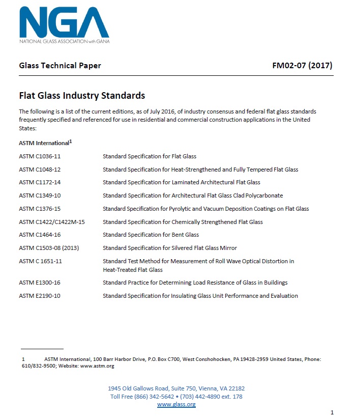This document provides a list of the current editions, as of July 2016, of industry consensus and federal flat glass standards frequently specified and referenced for use in residential and commercial construction applications in the United States. The Technical Services Division of the National Glass Association (NGA) has produced this Glass Technical Paper solely for informational purposes. This Paper was developed by dedicated member volunteers and subject matter experts. This document was originally published in 2007. This edition of the bulleting provides the most recent update and published in January 2017. All purchases will be electronically accessed or delivered.