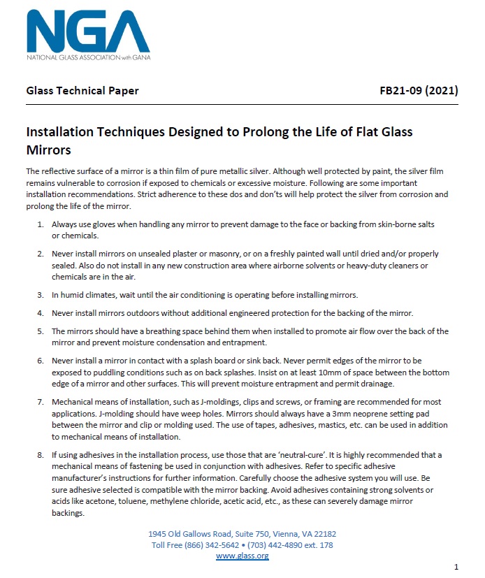 Installation Techniques Designed to Prolong the Life of Flat Glass Mirrors (FB21-09) - Downloadable Out of Stock