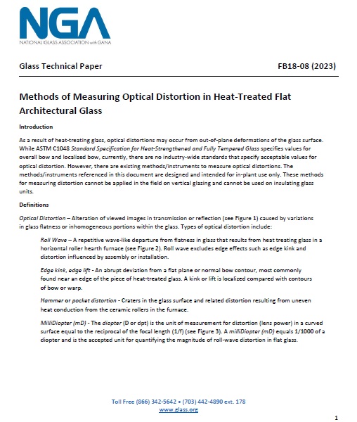 The Technical Services Division of the National Glass Association (NGA) has produced this Glass Technical Paper solely for informational purposes. This Paper was developed by dedicated member volunteers and subject matter experts. The original version of this document was approved and published in 2008. This version of the document was updated and published in June 2023. All purchases will be electronically accessed or delivered.