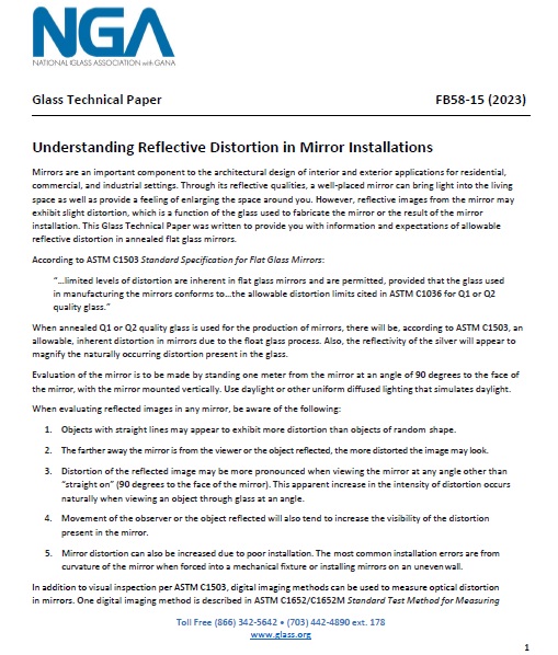 Mirrors are an important component to the architectural design of interior and exterior applications for residential, commercial, and industrial settings. Through its reflective qualities, a well-placed mirror can bring light into the living space as well as provide a feeling of enlarging the space around you. However, reflective images from the mirror may exhibit slight distortion, which is a function of the glass used to fabricate the mirror or the result of the mirror installation. This Glass Technical Paper was written to provide you with information and expectations of allowable reflective distortion in annealed flat glass mirrors.